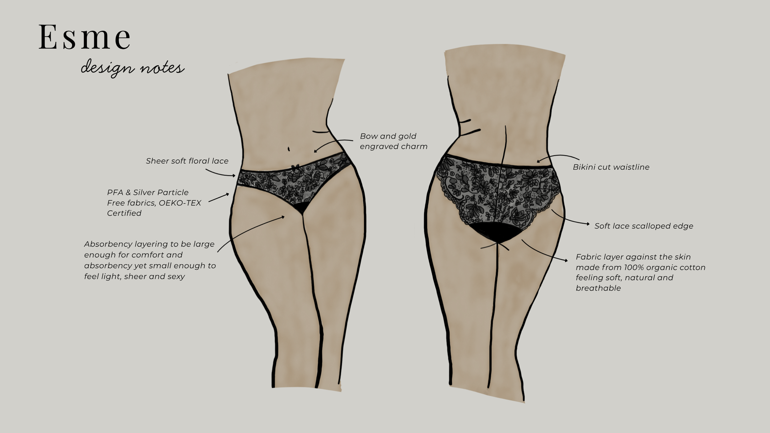 Designed to feel weightless and whisper light, the Esme absorbs up to three tampons worth of fluid. This starts with a layer of organic cotton to feel soft and natural against your skin, followed by two layers of highly absorbent towelling to keep you feeling dry, then a layer of breathable TPU, the final layer of protection creating highly absorbent, and comfortable lingerie.